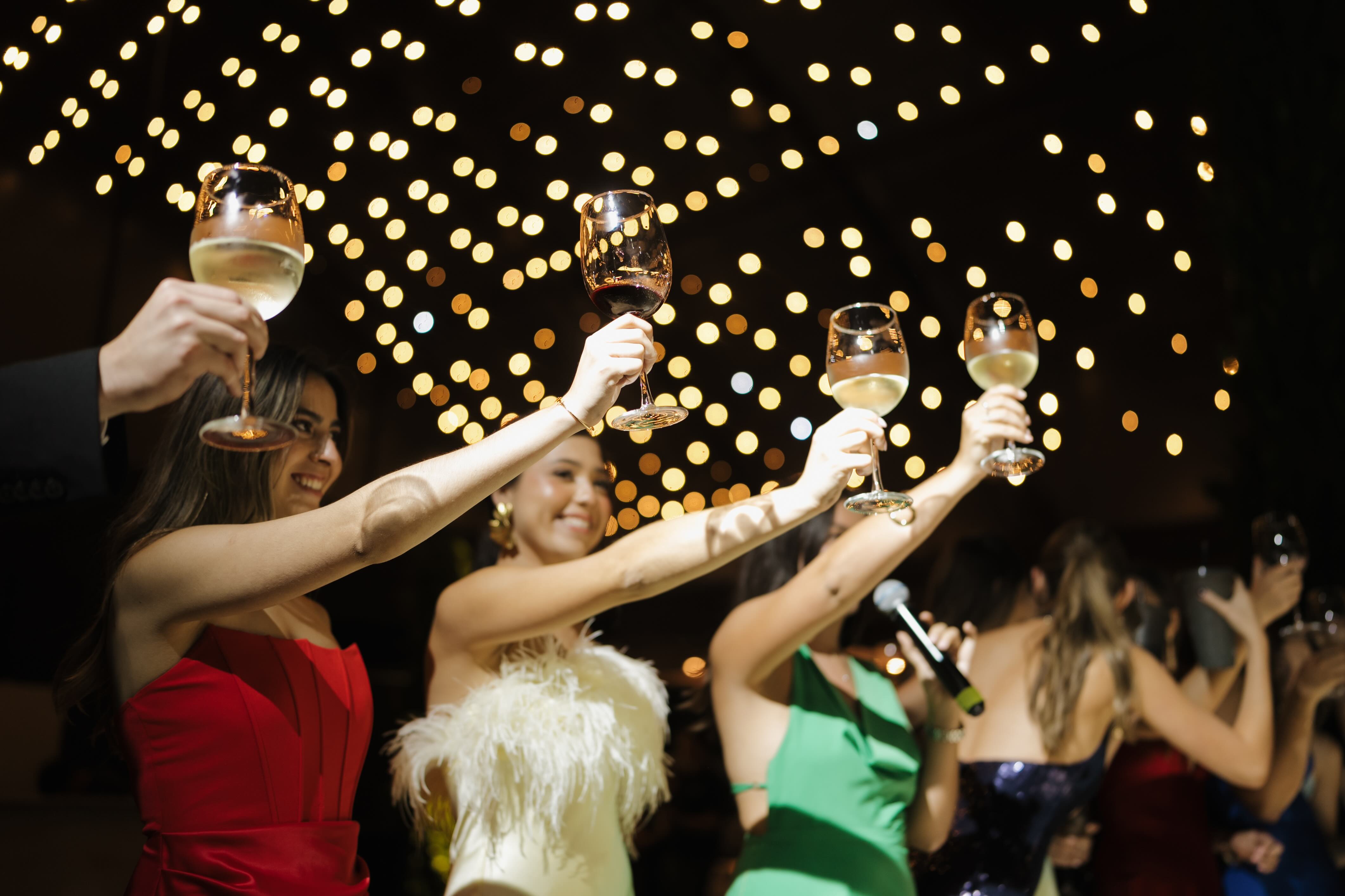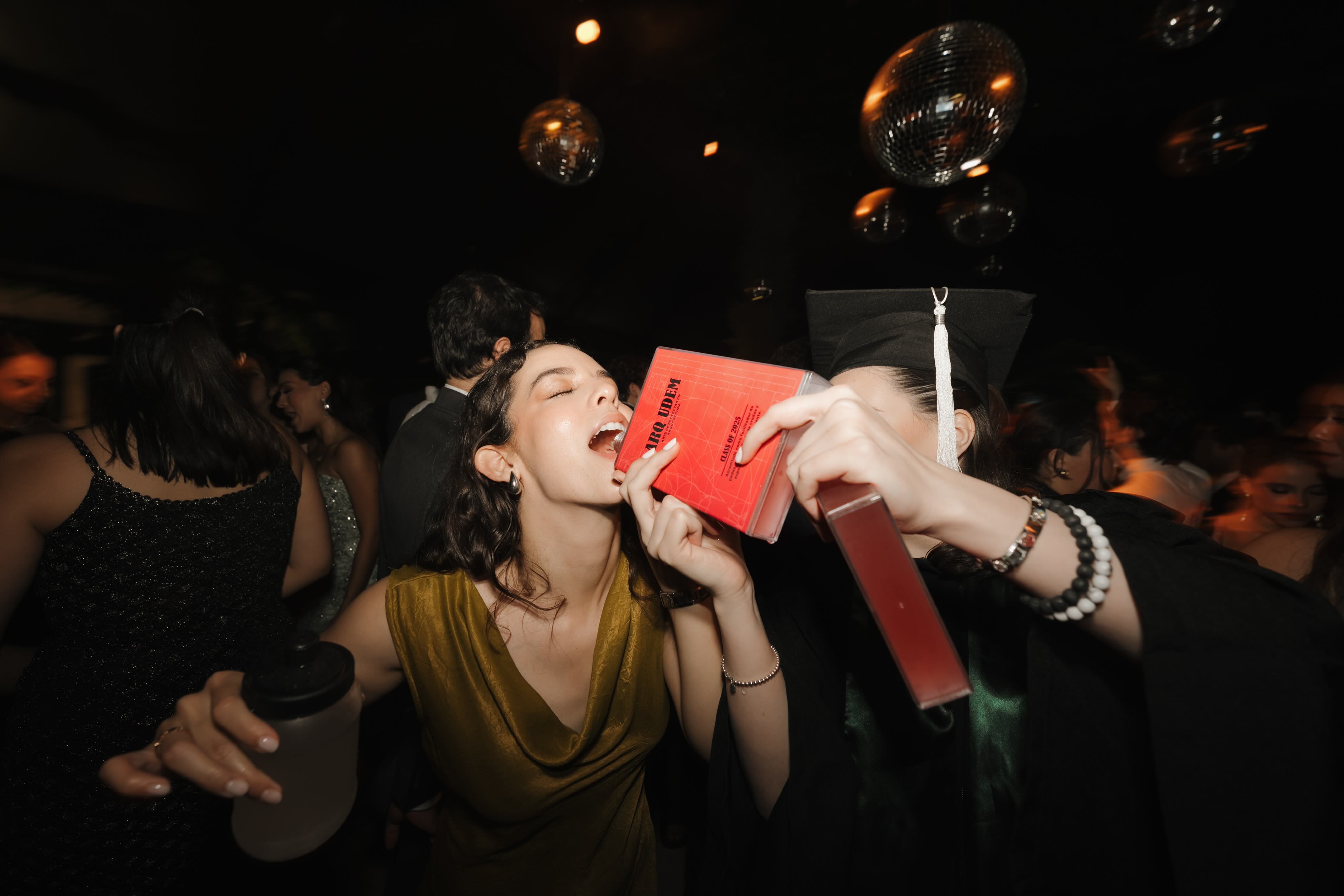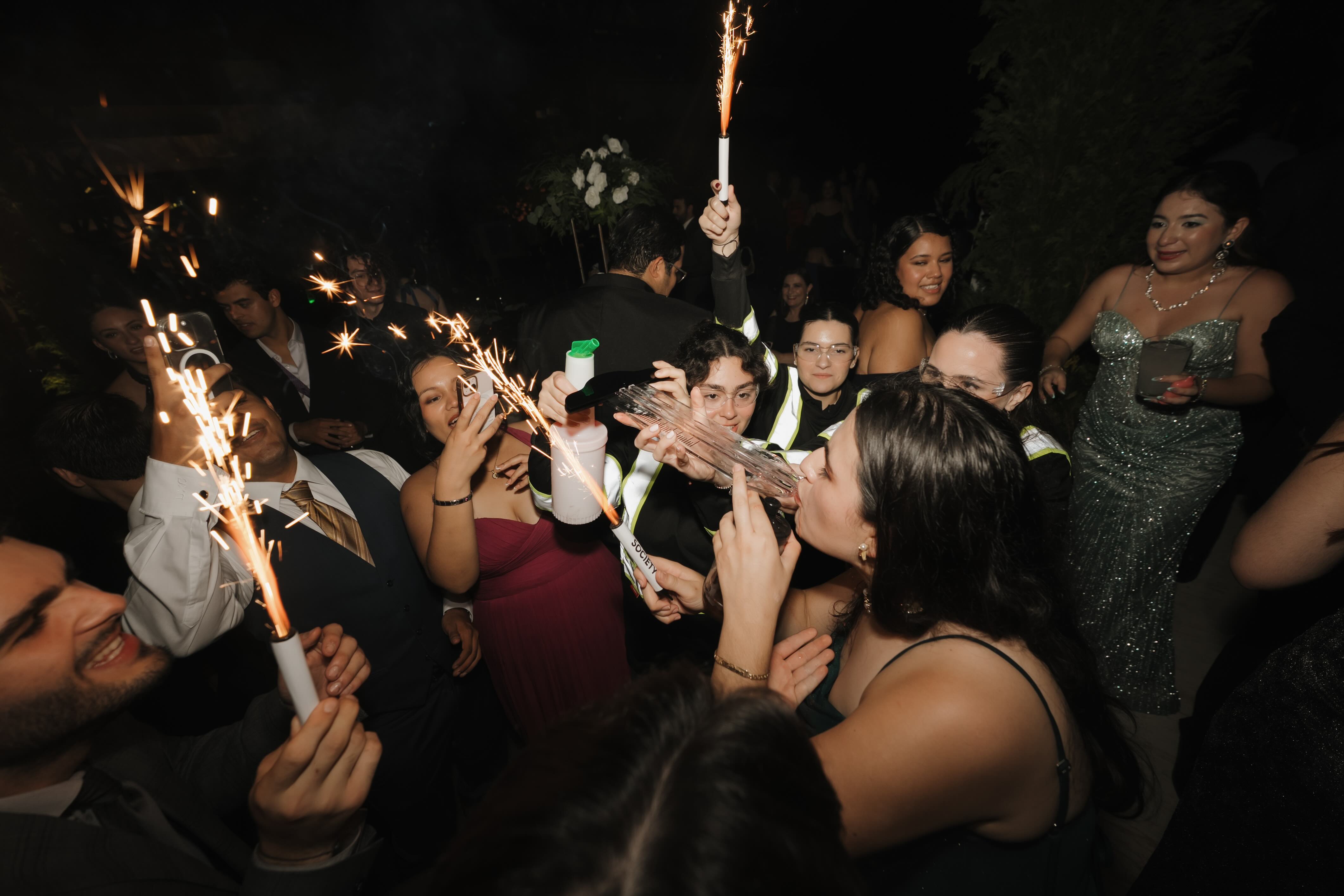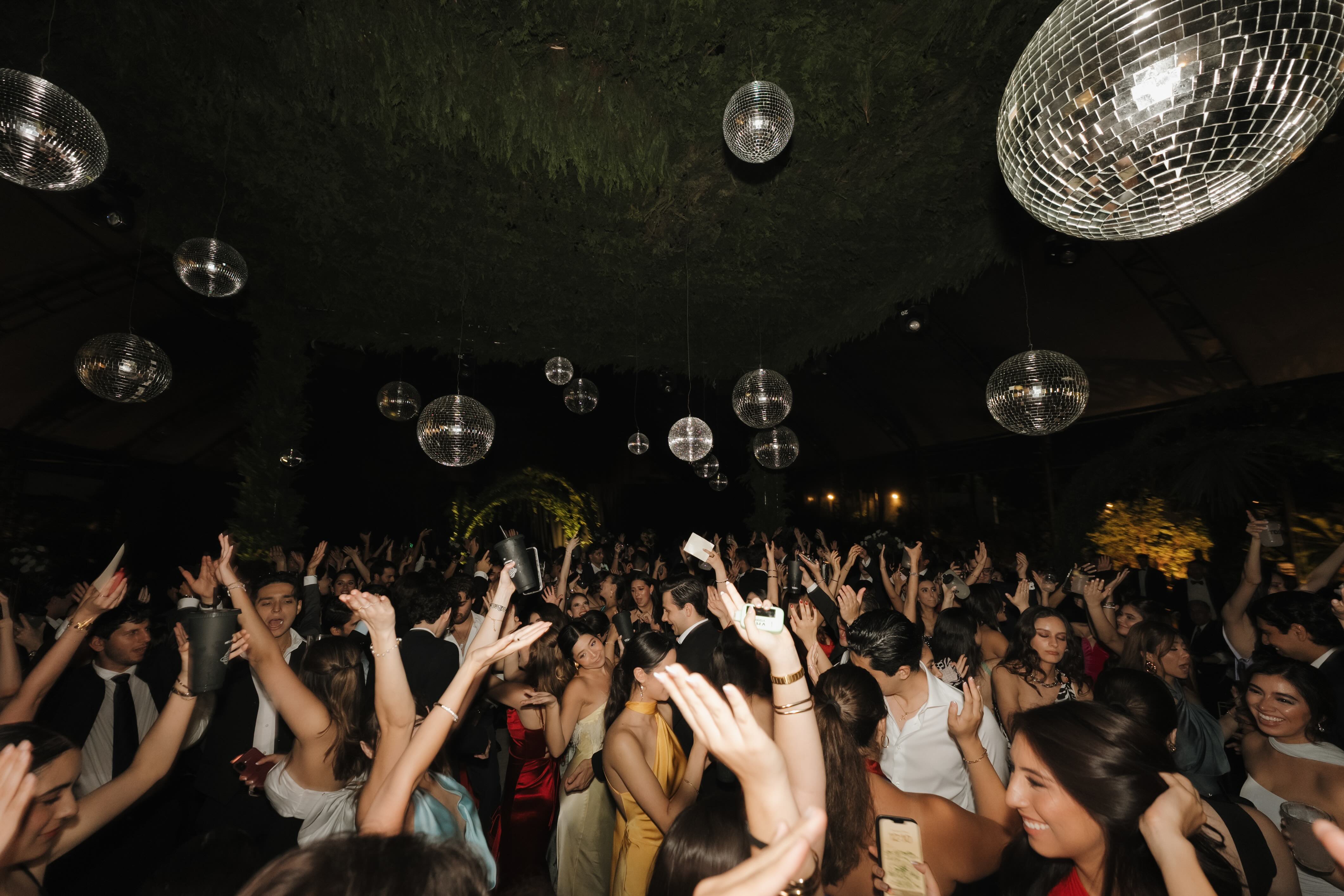This chapter of the night unfolded beneath a suspended canopy of greenery and mirrored spheres, where warm lights and star-like ceilings transformed the venue into an immersive landscape. The architecture of the space framed every portrait with depth and intention, balancing modern elegance with a sense of theatrical scale. From the glowing dance floor to the layered textures overhead, the atmosphere set the tone for a celebration designed to feel cinematic from every angle.